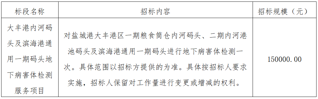 一、江蘇鹽城港港航勘測設計有限公司負責實施的大豐港內河碼頭及濱海港通用一期碼頭地下病害體檢測服務項目已具備招標條件,項目所需資金已落實,現通過公開招標方式邀請潛在投標人參加本項目的投標。