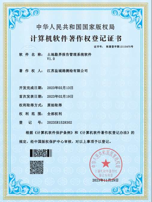 鹽城港港航勘測設(shè)計(jì)公司一直高度重視技術(shù)發(fā)展創(chuàng)新和知識(shí)產(chǎn)權(quán)保護(hù),現(xiàn)已獲得測繪OA綜合管理系統(tǒng)軟件、地形測量數(shù)據(jù)處理與繪圖成圖系統(tǒng)、航空攝影測量數(shù)據(jù)采集軟件、三維建模數(shù)據(jù)處理和信息管理軟件、土地勘界報(bào)告管理系統(tǒng)軟件五項(xiàng)軟件著作權(quán)。