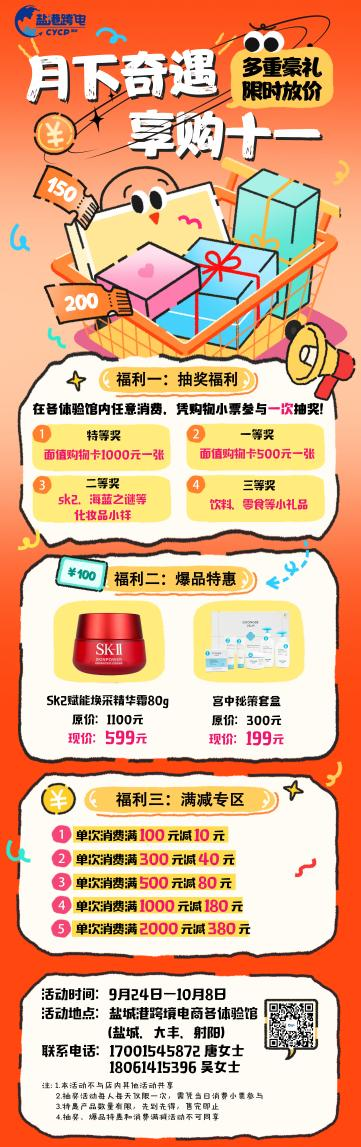 莎士比亞跨境電商國際商貿(mào)小鎮(zhèn)將于2025年9月24日至10月8日推出以“月下奇遇,享購十一”為主題的系列促銷活動。活動期間,消費(fèi)者可在鹽城、大豐、射陽三地的跨境電商體驗館享受多重福利:消費(fèi)即可參與100%中獎抽獎,獎品涵蓋千元購物卡、熱門美妝小樣等;單筆消費(fèi)滿100元起即可參與多檔滿減優(yōu)惠,最高立減380元;更有爆款單品直降促銷,如SK2賦能煥采精華霜由原價1100元優(yōu)惠至599元,誠意回饋顧客。本次活動通過線上線下多渠道聯(lián)動宣傳,并提前備足貨源、優(yōu)化服務(wù)流程,力求為消費(fèi)者帶來優(yōu)質(zhì)、便捷的購物體驗,進(jìn)一步激發(fā)節(jié)日消費(fèi)市場活力。