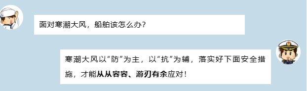 2、提前研判防抗措施。結(jié)合船舶抗風(fēng)等級(jí),預(yù)先做好寒潮大風(fēng)防抗準(zhǔn)備,抗風(fēng)能力較差的船舶選擇安全水域進(jìn)行避風(fēng)。